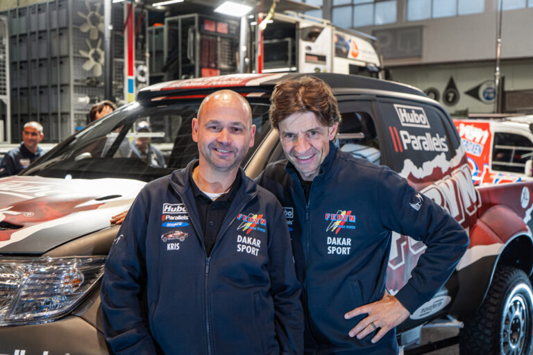 Een Toyota Hilux T1 is nog te runnen als privé-team. “De Hilux is opgebouwd op een buizenframe. De aandrijflijn is van Lexus, met een 5-liter V8 onder de motorkap, goed voor 350 pk en 560 Nm koppel. We stappen van een V8 turbodiesel over naar een 5-liter V8 benzinemotor. Qua differentieel en versnellingsbak is alles afkomstig van Sadev, een sequentiële zesbak met een powershift. Het is echt een racemachine. Het zal wel een paar wedstrijden duren voor Koen en Pascal het maximum uit de Hilux kunnen halen. We zijn wel gaan testen in Spanje, waar ongeveer 350 km getest werd.”